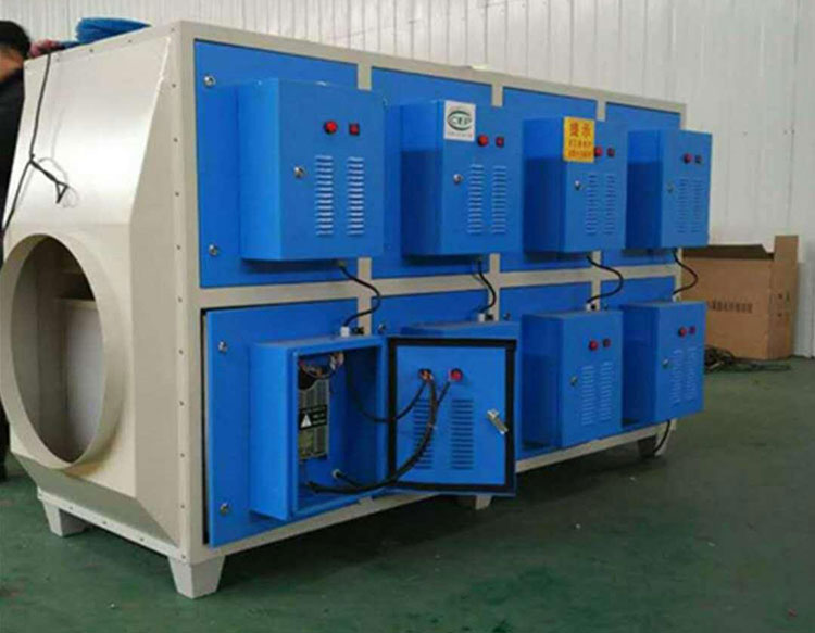 等离子净化设备内部装有独特的碰吸单元,截留去除废气中的颗粒物质,废气收集系统收集的多元素气体经过等离子活性氧净化装置,在高压等离子电场的作用下,电离初始态氧将其中的废气离子进行电离荷电净化,带电的微小离子(尘埃粒子)被吸附单元所收集并流入和沉积到气体处理装置的储尘箱内,气体内的有害气体被电场内所产生的臭氧所杀菌,并去除了异味,有害气体被除掉,达到废气处理的目的。