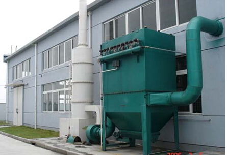 工作时,含尘气体由车间除尘设备的进风道进入灰斗,粗尘粒直接落入灰斗底部,细尘粒随气流转折向上进入中、下箱体,粉尘积附在滤袋外表面,过滤后的气体进入上箱体至净气集合管-排风道,经排风机排至大气。清灰过程是先切断该室的净气出口风道,使该室的布袋处于无气流通过的状态(分室停风清灰),然后开启脉冲阀用压缩空气进行脉冲喷吹清灰,切断阀关闭时间足以保证在喷吹后从滤袋上剥离的粉尘沉降至灰斗,避免了粉尘在脱离滤袋表面后又随气流附集到相邻滤袋表面的现象,使滤袋清灰彻底,并由可编程序控制仪对排气阀、脉冲阀及卸灰阀等进行全自动控制,由此使积附在滤袋上的粉尘周期地脉冲喷吹清灰,使净化气体正常通过,保证除尘系统运行。当含尘气体由进风口进入,经过灰斗时,气体中部分大颗粒粉尘受惯性力和重力作用被分离出来,直接落入灰斗底部。含尘气体通过灰斗后进入中箱体的滤袋过滤区,气体穿过滤袋,粉尘被阻留在滤袋外表面,净化后的气体经滤袋口进入上箱体后,再由出风口排出。另外,随着时间的增加而积附在滤袋上的粉尘越来越多,增加滤袋阻力,致使处理风量逐渐减少,为正常工作,一定要控制阻力在一定范围内(140--170毫米水柱)。