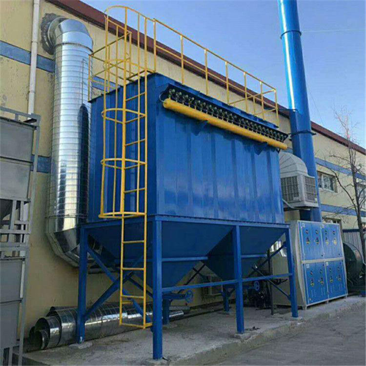 当过滤压差达到设定值时,压差传感器提供电信号给PLC等自动控制系统,程控仪开始工作,首先关闭上箱体启动提升阀,使整个箱体室内处于低压状态,然后逐个开启低压脉冲阀,让干燥压缩空气通过喷吹管、导流喷嘴对该行滤袋进行喷吹清灰,在瞬间高压反向气流作用下,使滤袋突然膨胀,波浪前行,使附于滤袋表面的粉尘层迅速脱离滤袋落入灰斗,粉尘经卸灰阀排出;PLC等自动控制系统也可采用时间继电器输出信号,对滤袋逐行定时喷吹清灰;所有脉冲阀完成一次清灰循环后,PLC等自动控制系统自动开启启动提升阀,使整个袋式除尘器又恢复到过滤烟气、吸附灰尘的状态。