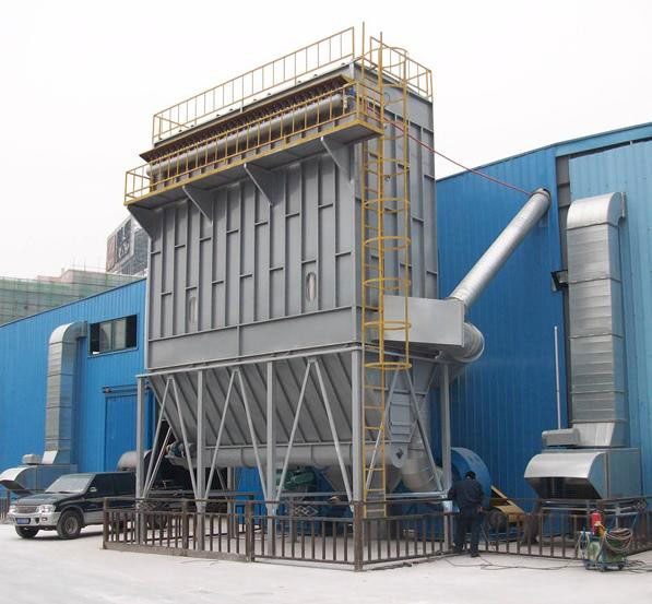 含尘粉尘由进风总管进入,经导流管进入各单元灰斗,在灰斗导流系统的引导下,大颗粒粉尘分离后直接落入灰斗、其余粉尘随气流进入中箱体过滤区,过滤后的洁净气体透过滤袋经上箱体、出风管排出。随着过滤工况的进行,当滤袋表面积尘达到一定量时,由PLC等控制系统按设定程序控制,打开电磁脉冲阀喷吹,抖落滤袋上的粉尘。落入灰斗中的粉尘经卸灰阀等输灰设备送出。